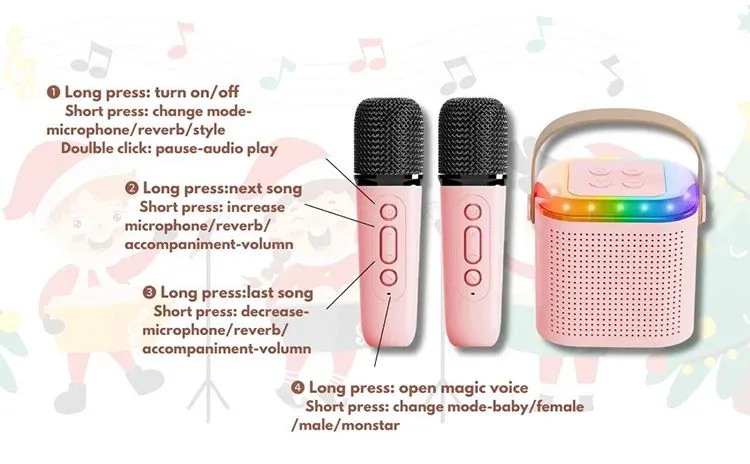 • Dual Microphone Karaoke Machine :Enjoy singing with friends and family with two wireless microphones included.